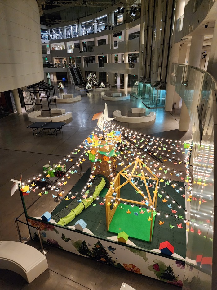 Зеленая волнистая задняя стеночка - это велкроткань для аппликаций (заготовлено 1400 элементов из фетра). А вторая белая стенка уже затянута бумагой для рисования - рулон видно сбоку от стенки.