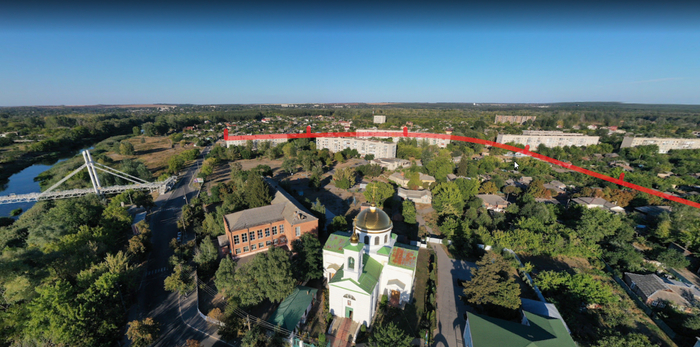 С южной стороны почти сразу располагалась школа, левее и чуть дальше пятиэтажки, справа Храм и какие-то двух этажные дома.
