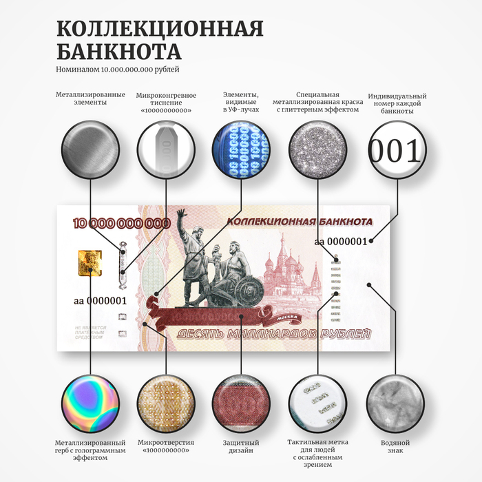 Данная купюра - банкнота 10000000000 рублей (не является платежным средством) - вариант художественного исполнения, предлагаемого художниками в формате концепции обновлённого дизайна банкнот Российской Федерации. Художественная композиция банкноты состоит из изображений великолепных достопримечательностей одного из самых красивых городов мира - Москвы. В новой сувенирной банкноте порядка 10 самых сложных защитных элементов, и отдельно стоит выделить: рисунок, проявляющийся в УФ свечении, микроотверстия (видный на просвет из точек номинал банкноты), специальный глиттерный краситель для тактильных меток, фольгированные элементы с микроконгревным рисунком, голограммный металлизированный логотип, бумага с водными знаками, а также индивидуальная нумерация. Не является платежным средством.