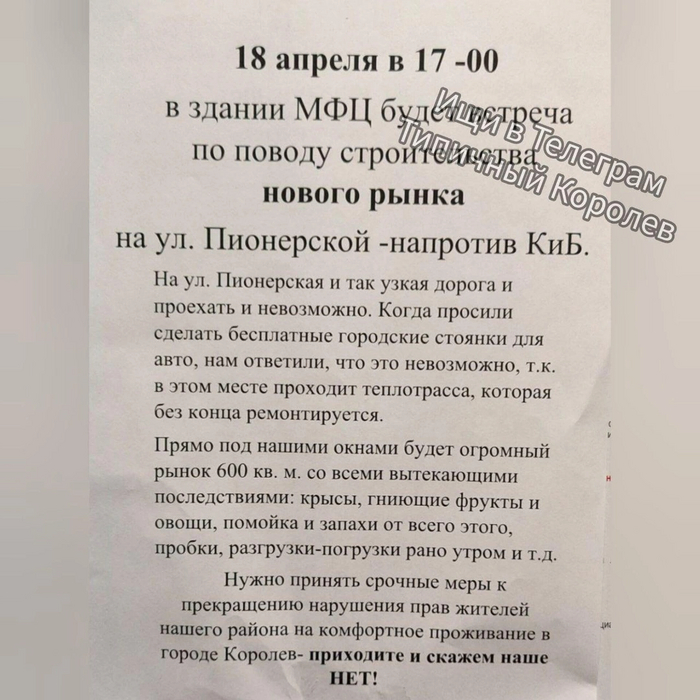 Согласно графику реализации проекта, сейчас уже должны начать стройку, но возмущенные жители подняли волну народного возмущения и 17 апреля 2024 года была организована встреча с депутатом Московской областной Думы Сергеем Керселяном, представителями администрации, где чиновники всеми правдами и неправдами пытались ответить на неудобные вопросы, среди которых "Зачем на этом участке необходим рынок?", если в данном районе нет острой необходимости в торговых площадях. В радиусе 300 метров есть сетевые магазины Ашан, Пятерочка, Веусвилл, несколько магазинов Дикси, Перекрёсток, красное и белое, ТЦ "Вертикаль", а также с десяток палаток торгующих овощами/фруктами. Хочется отметить мелочную подлость организаторов встречи с депутатом, когда в последний момент перенесли встречу на день раньше, чтобы избежать большого количества недовольных граждан и ограничили количество представителей жильцов до 10 человек. Ничем продуктивным естественно эта встреча не закончилась.