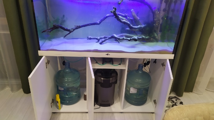 !!!Предупреждение номер три! Тумбу берите от производителя, я сильно сомневаюсь, что вы сэкономите, если купите ее где то или закажете (были такие мысли), дело в том, что надо держать 300+ кило, постоянно, долго + вода, рассохнется и тд + что там с ребрами жесткости? + что там с ножками на пол, 4 по умолчанию? В общем тумба должна быть непромокаемая, насколько возможно (на заказ это пппппппппц просто дорого, судя по моей ванной ценник в 3-4 раза сразу дороже х_х), должны быть ребра жесткости как поперечные, так и продольные (продольная хотя бы одна, дверки какбе есть, но сами понимаете, пояснять не буду как они "спасут", а то сбоку по пьяне боднете аквариум, он у вас вперед поедет, тк нет продольного ребра) и конечно сами ножки, они должны быть прямо под ребрами жесткости, если у вас будет их 4 всего, по углам, центр просто ляжет со временем, дальше перегрузка стекла аквариума, деформация стекла (условно, там и полмиллиметра хватит), дальше ремонт себе, соседям, зарытые мечты.