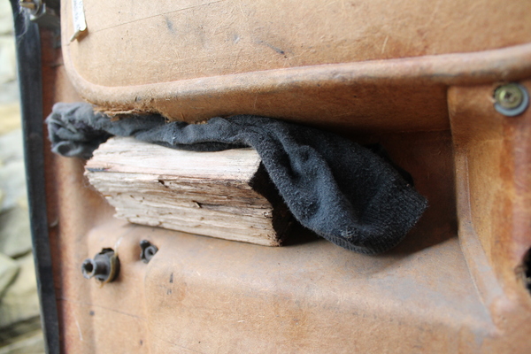 В общем скорее всего прежний хозяин продавил подлокотник,и решил таким образом его починить.И для эффекта сделал из старого протертого носка))))