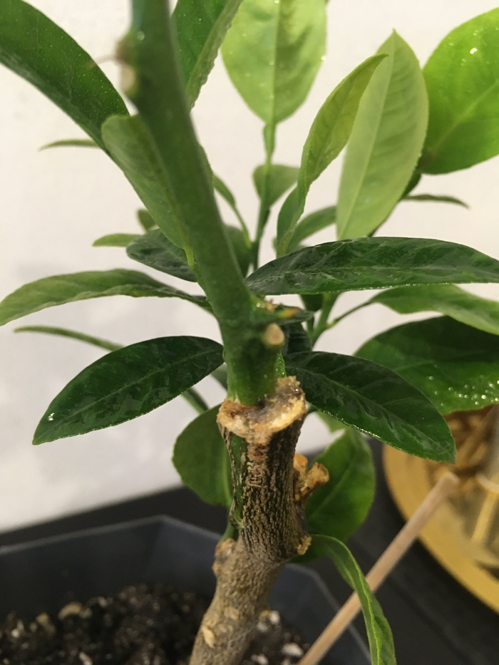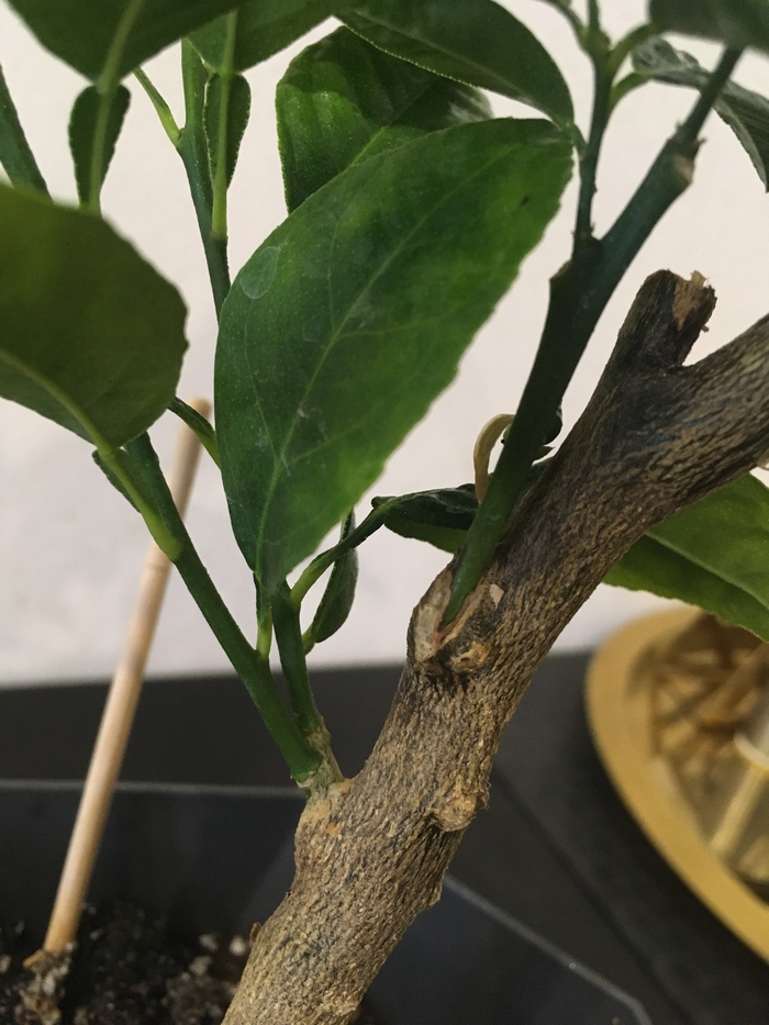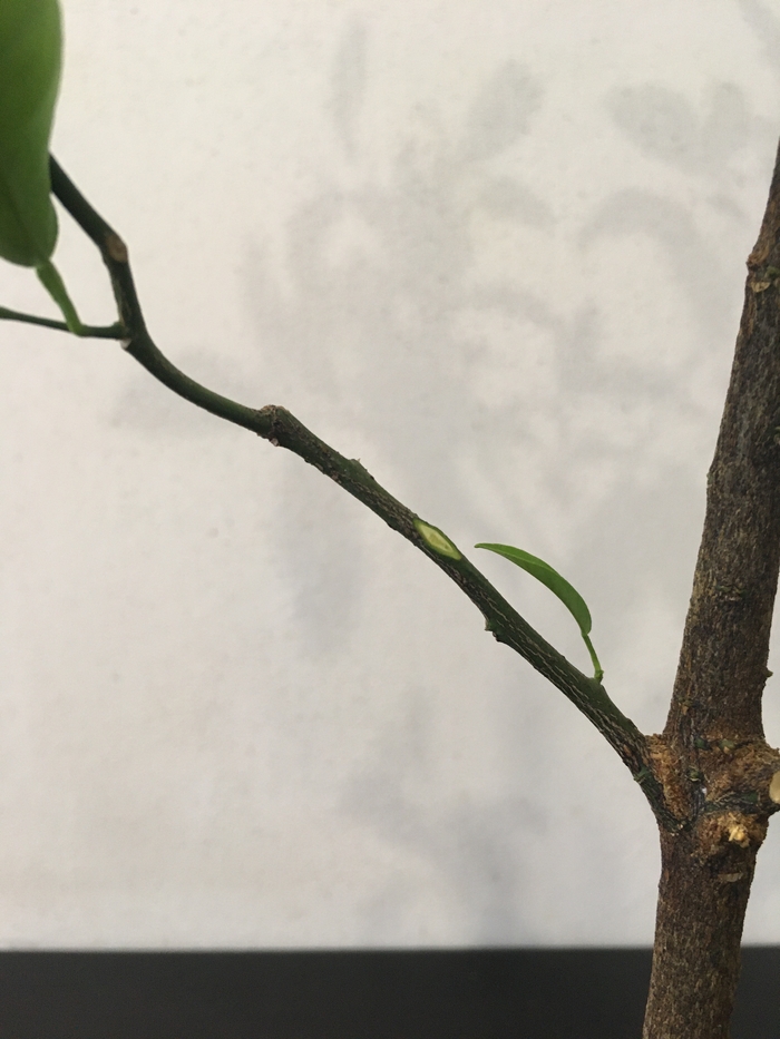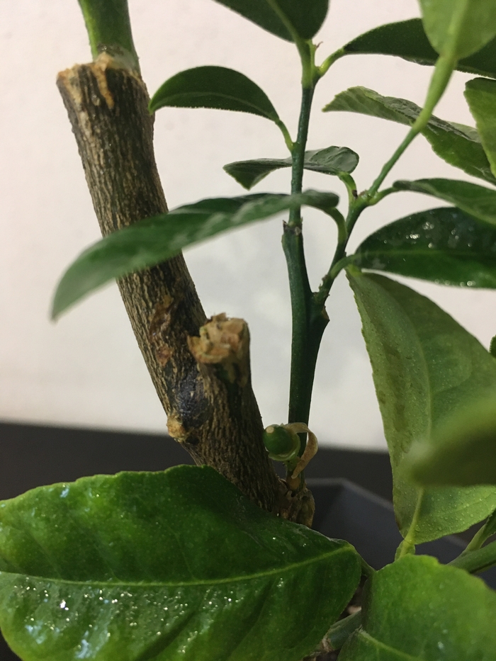 На всех прививках пошли приросты, одна, увы, не прижилась, такое бывает. Прививки разных сортов, а именно Мейер, неизвестный мне сорт лайма, мандарин Уншиу, Пандероза.