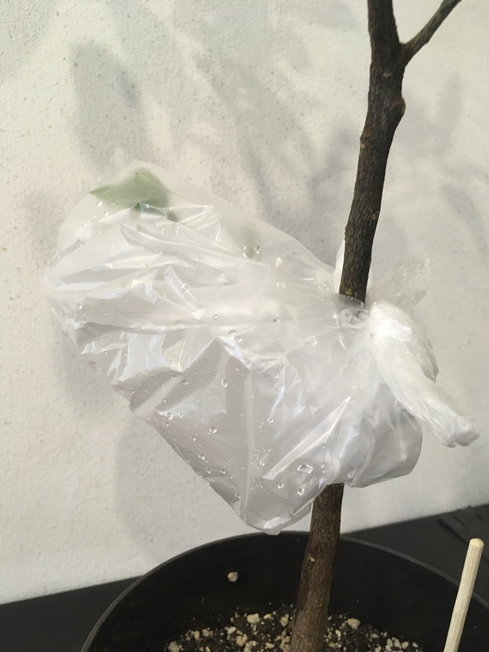 Берём пакет, увлажняем его водицей и надеваем его на нашу веточку, чтобы создать там влажный парниковый эффект.