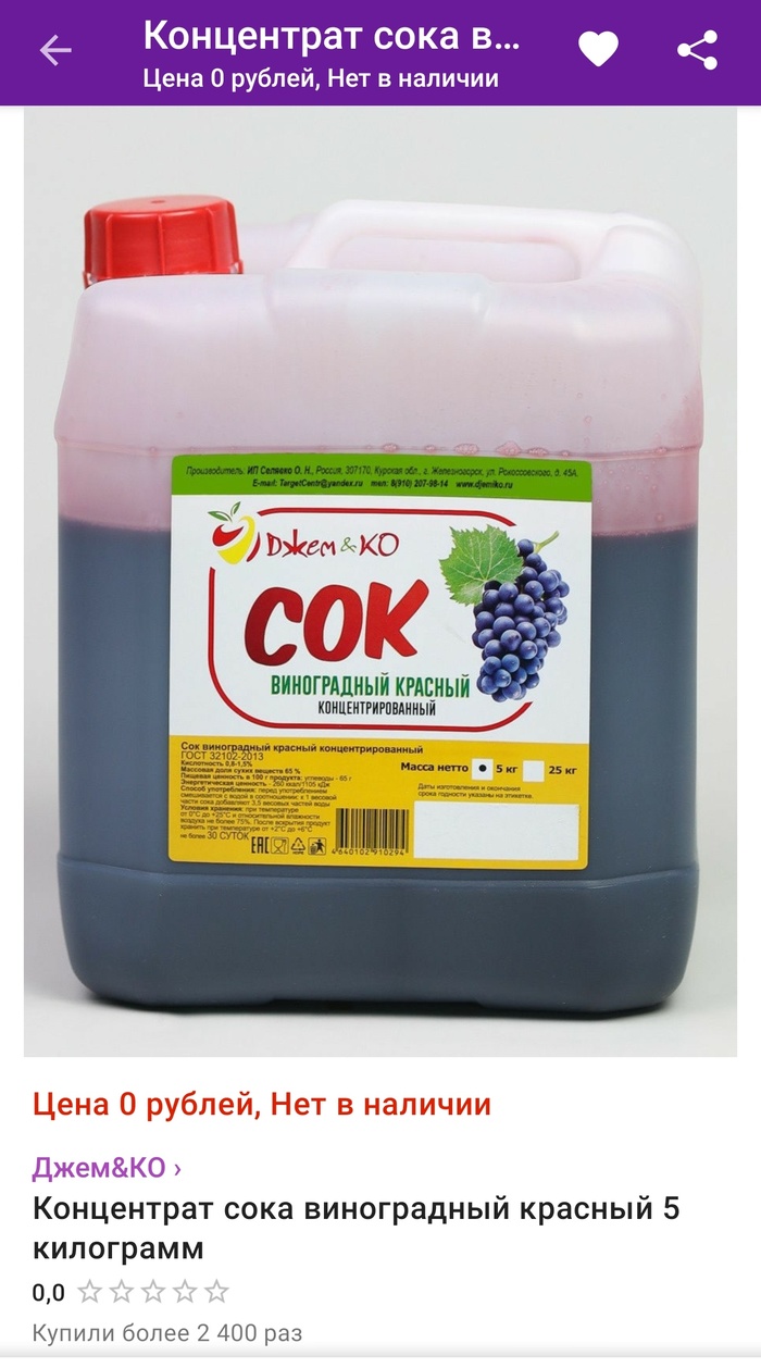 После моего отзыва этот сок был сразу снят с продажи в этом магазине. Но появился почти сразу в другом не менее известном интернет- магазине. Как проверяют производителей пищевой продукции, ведь нас же травят безнаказанно.