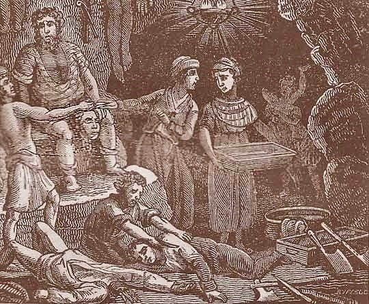 Если кто-то подумал, что в Средневековье убийство лопатой было распространенным преступлением, то это не так. На самом деле, на этих рисунках изображен библейский сюжет об убийстве Авеля Каином. По какой-то причине, средневековые иллюстраторы считали, что Авель был убит в поле. Таким образом, в руках Каина должна быть лопата. Логично. Но не совсем, так как в Библии написано, что орудием убийства было…было…а Библия не говорит каким конкретно оно было. Это могла быть дубина (тоже часто попадается в произведениях искусства), камень или нож для осуществления жертвоприношений.