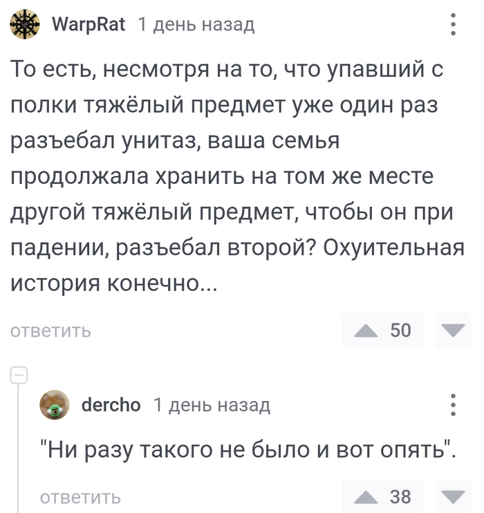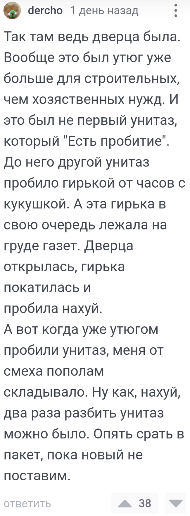 3273 WOWCHES Скриншоты комментов Место хранения 1 год назад #comment_297407164 Показать полностью 4 Скриншот Комментарии на Пикабу Туалет Унитаз Мат Утюг Полочка Длиннопост 64 1 1 Ещё 0
