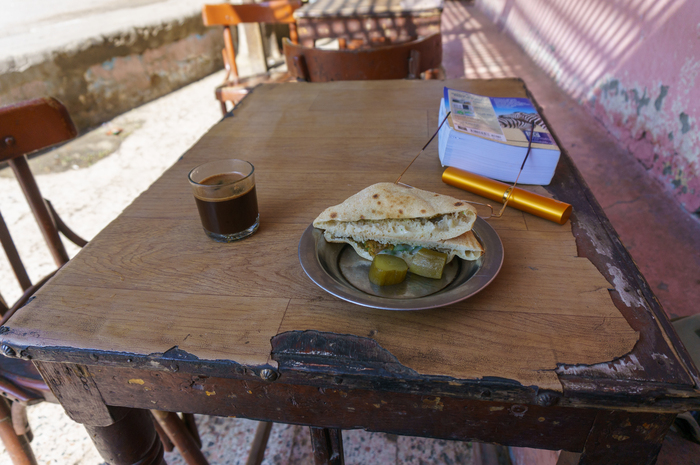 Интересно, что много кто просил меня выкладывать фото еды. Обычно, я не имею такой привычки, но фото еды из Луксора у меня осталось. Вот вам стандартная уличная еда в Египте. Пита с мясом, солёный огурец и чашка кофе.