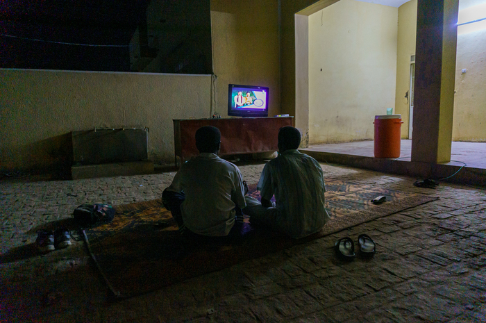 В гостинице постояльцы увлечённо смотрели телевизор прямо на улице