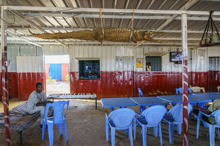Периодически останавливались в кафе на дороге. Кафе весьма незатейливы. Хозяин/повар спит там же где и готовит, под потолком висит крокодил.