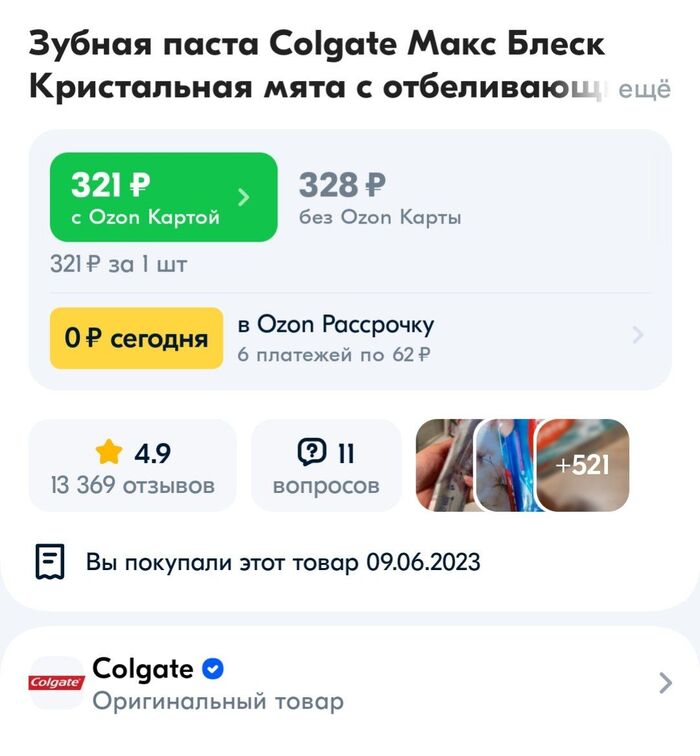 Сегодня прислали поддельную зубную пасту Colgate, сразу показался странным тюбик. Почистил зубы и сразу все стало ясно. Почитал отзывы, всё пишут подделка. И знаете желание покупать что либо на озоне пропало полностью. За последний месяц, поддельный порошок tide, поддельный крем для лица Nivea , для рук dove, поддельный шампунь, поддельный кофе по цене настоящего. Ничего озон не смущает. Колличество подделок просто зашкаливает. На отзывы им даже плевать. Раньше тыкали липовыми сертификатами на попытку оставить отзыв о подделке, сейчас им все равно. Удачи в бизнесе по обману покупателей. Я завязываю у вас что либо покупать.