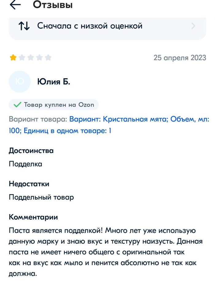 мой совершенно адекватный отзыв не опубликовали. на фоне остальных подделок это стало последней каплей. после это гадской пасты такое противное ощущение, гадский вкус и зубы как будто и не чистил.
