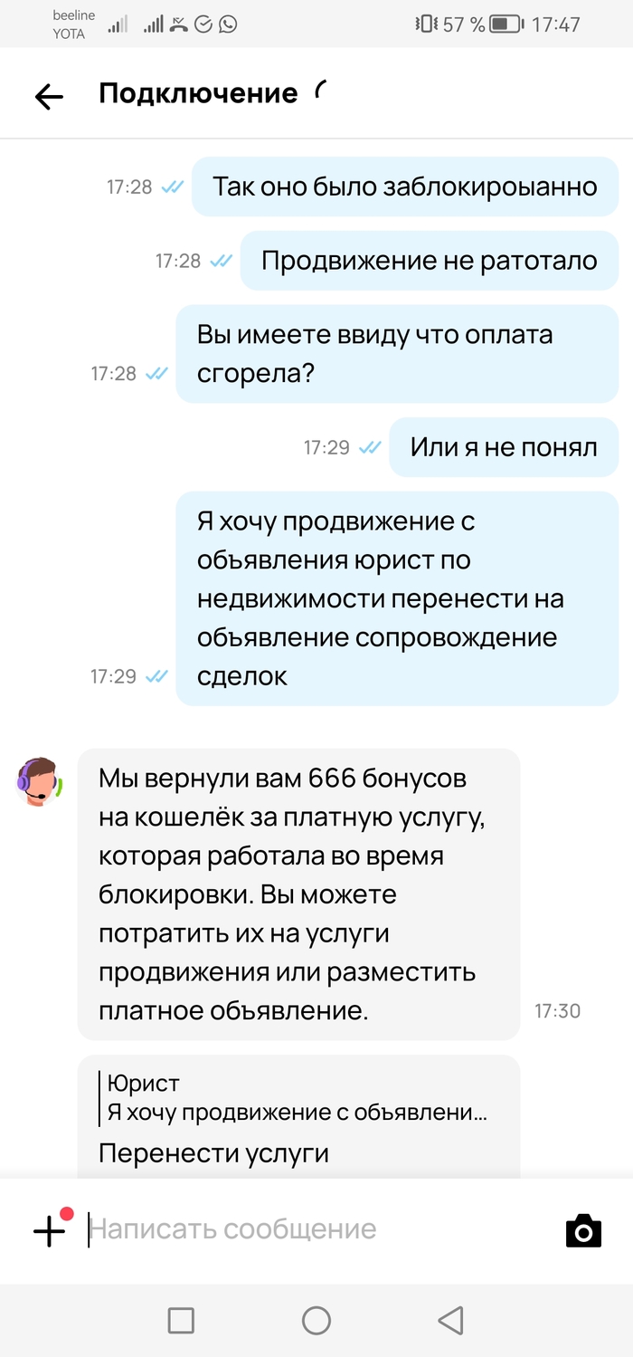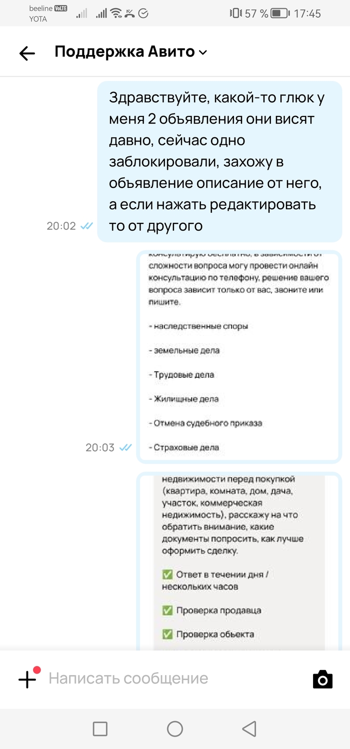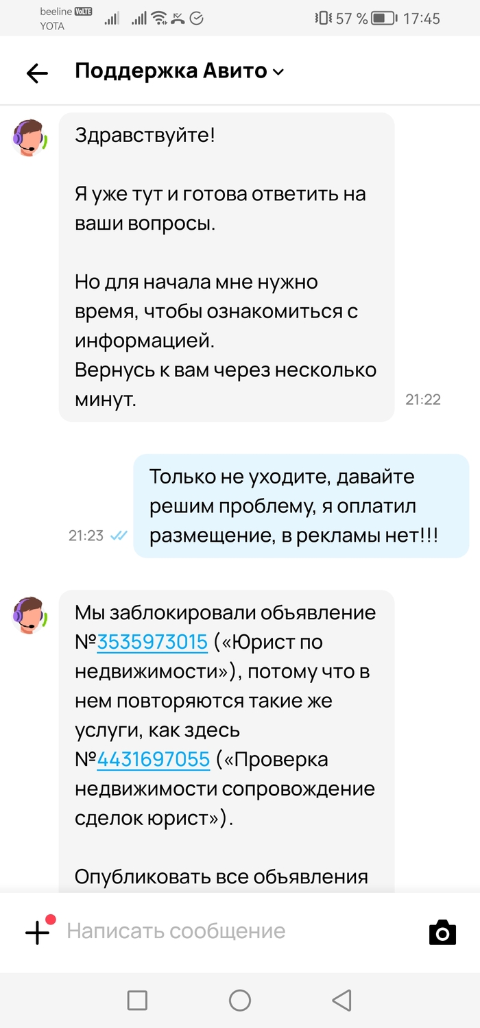 P.S.(3) Очень много людей которые честно работают на авито, либо просто покупают/продают свои вещи, и которых авито решило заблокировать без права на реабилитацию, я так полагаю что множно создать петицию, обратится коллективно в контролирующие ограны, в верховный суд РФ для создания практики (прецендента), чтобы была возможность использовать все функции авито, либо обратится совместно в авито чтобы была разработана возможность пользоватся авито в полной мере, авито уже не просто интернет ресурс по купле-продаже, аналога, либо конкурента авито нет в россии, авито зарабатывает на нас деньги, но при этом какого либо договора между нами нет, только оферта согласно котоой ониделают что хотят. Считаю неравнодушным нужно собратся, я уверен есть люди профессионалы, если соберется много людей в частифинансовых затрат для каждого это будет незначительно, но зато мы будет боротся за возможность честно заработать, мы не обкрадываем бабушек, не обнамывем никого по телефону, не совшаем даже морального нарушения, а просто хотим пользоватся тем чем по закону можем пользоватся, зарабатывать на этом, и платить налоги, либо просто продавать свои вещи. В ближайшие дни изучу возможность создать петицию, площадки на которых это возможно сделать, не равнодушным прошу откликнутся, люди которые в этом разбираются прошу присоединится и помочь, москва не сразу строилась давайте действовать!
