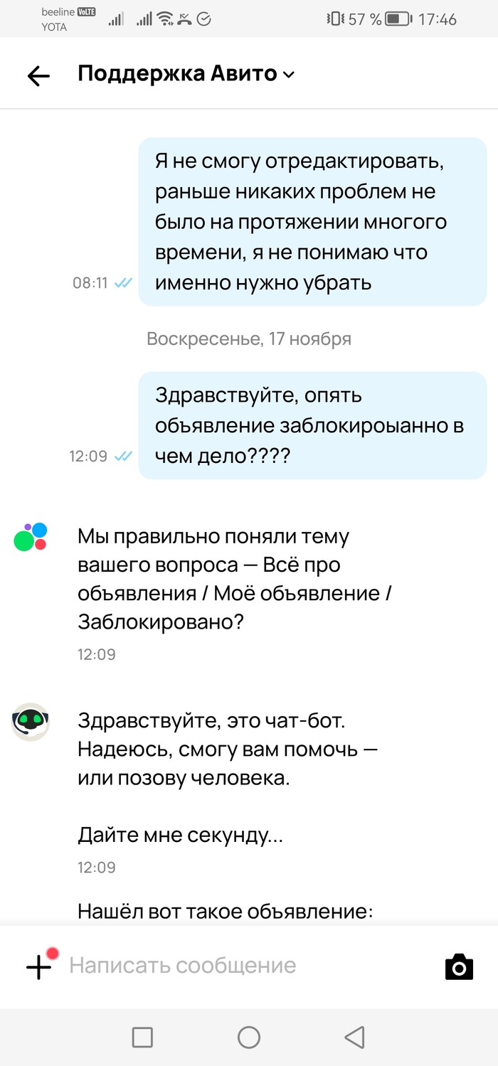 Не прошло и двух лет как меня снова заблокировали на авито, изучив другие посты на пикабу можно легко прийти к выводу, что их ИИ говно собачье, а люди которые там работают говно собачье 2.0, и вместо мозгов у них похоже тоже ИИ. Ну как так можно, я уже очень много лет пользуюсь авито, достаточчно длительное время у меня не было проблем, но недавно я попал в аварию, и решил выложить свою машину на авито, и буквально спустя час мой аккаунт вылетает, и мне предлагают покрутить яйцами головой на видео, и так как мне нечего скрывать, я взял и покрутил. С этого момента началась моя переписка с авито. Во первых аккаунт мне блокируют не впервый раз по одной и тойже причине потомучто раньше когдато у меня была пройдена проверка, но очень интересно что в моем нынешнем аккаунте тоже была ПРОЙДЕНА ПРОВЕРКА, и возникает вопрос как тогда в двух аккаунтах может быть пройдена проверка, можеыт быть значек надежный исполнитель, и документы прверены. Авито знает что мои данные етсть в другом аккаунте, дал мне пройти проверку, но при этом по какойто причини решил сейчас заблокировать. А так как я не знаю что за аккаунт и кто проходил проверку, авито существует уже более 15 лет почему при смене правил они не удалили старые аккаунты и проверку, откуда я знаю кто воспользовался моим паспортом 10 лет назад и прошел проверку.