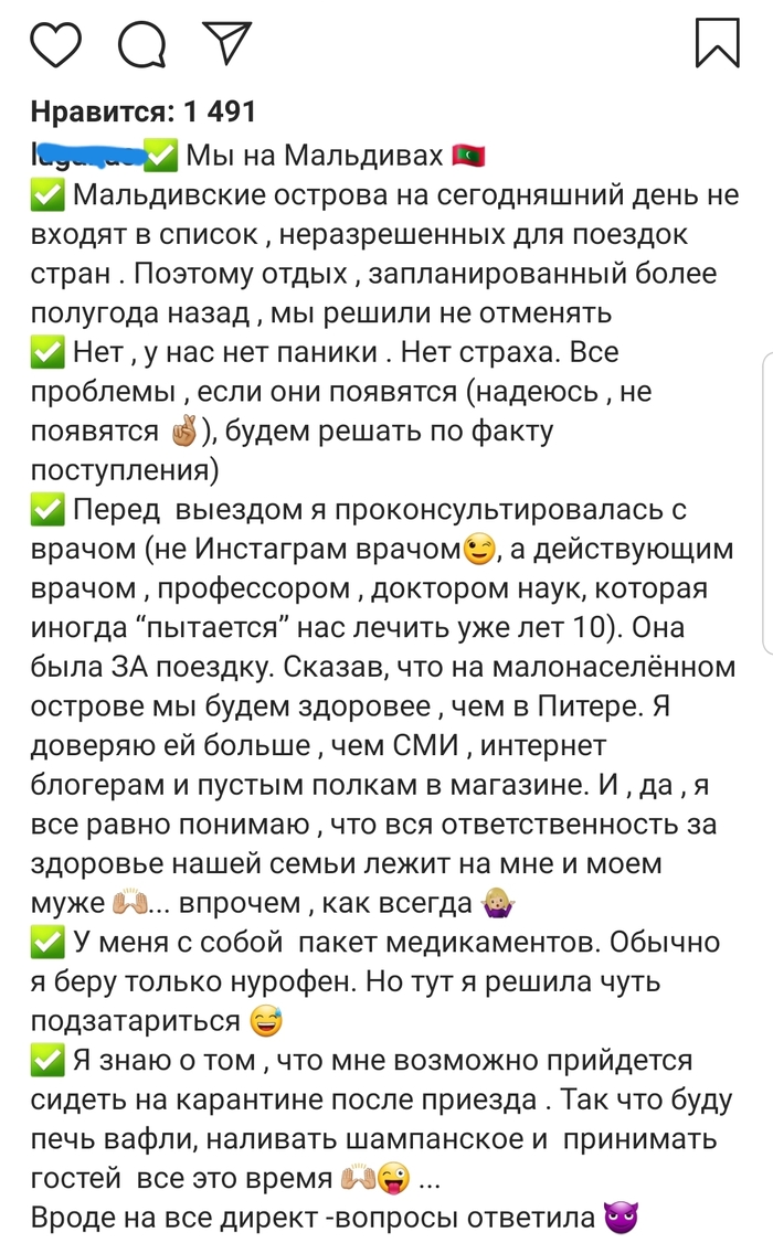 Увидела вот этот пост О важности карантина и расстроилась, что некоторые люди действительно не понимают, насколько важно сейчас по возможности не выходить из дома и строго соблюдать карантин, притом, что говорят об этом на каждом углу, и нельзя сделать вид, что "ты не знал". Но они, видимо, и не хотят понимать, ставя свои сиюминутные интересы выше жизни других. Вот скрины из аккаунтов моих знакомых, которые несколько дней назад(!) с семьями(!) улетели на отдых из Москвы и Питера. Обоснование поездок однотипное - "ну мы давно отпуск запланировали, что, теперь отменять? Да и в этих странах вируса нет!". Честно - не знаю, как реагировать. Они не бояться за свою жизнь, за жизнь своих детей - хорошо, это их дело, я не лезу. Мне удивительно и страшно, что взрослые, адекватные на первый взгляд люди, так наплевательски относятся к здоровью других людей, зная, что могут стать перенесчиками заболевания. Зная, что это заболевание может привести к смерти. Наверное, если они до сих пор не поняли, почему им не стоит в разгар пандемии ехать в отпуск, то и нет смысла им объяснять, да?