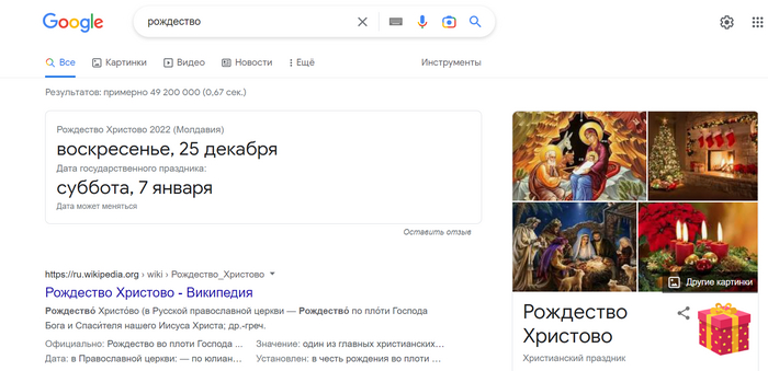 Недавно нужно было найти информацию, связанную с Рождеством. Вбила в гугл слово "christmas". Сначала все было как обычно, а потом на странице в браузере появился такой значок подарка. Любопытство взяло верх и я нажала на него)