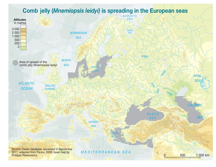 Рис. 3. Морфологические различия гребневика мнемиопсиса из Чёрного, Азовского и Каспийского морей (Шиганова, 2009).