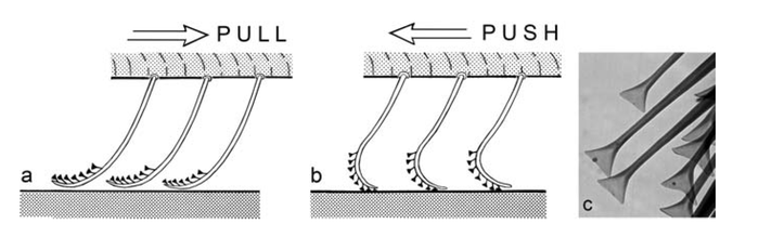 На кончиках лапок пауков есть маленькие волоски, зовущиеся Scopulae. На концах этих волосков находится по 500-1000 маленьких «ножек» (с на картинке ниже). То есть, получается, у паука есть ноги, у которых есть волосы, у которых есть ноги.