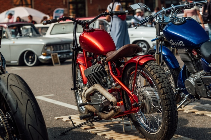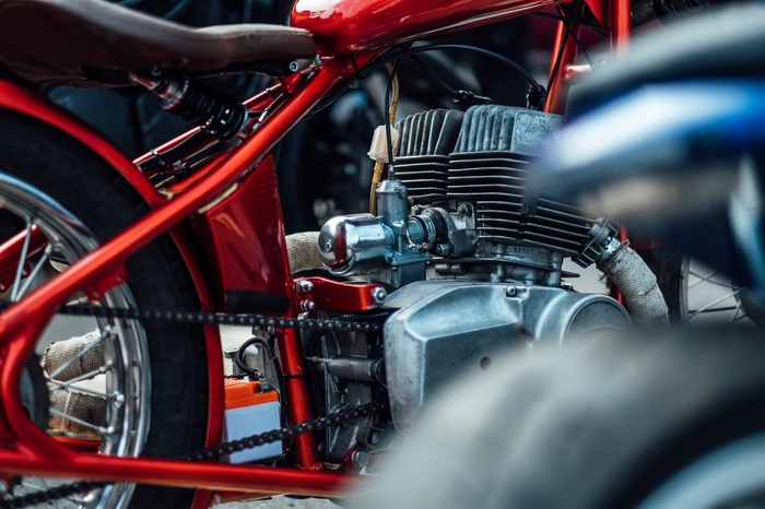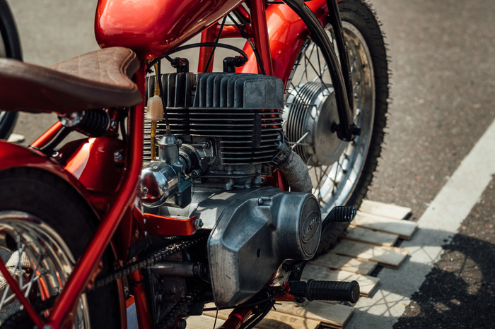 — покраска была выполнена в цвет красный Кенди на серебристой подложке. За счет такой покраски мотоцикл на солнце переливается оттенками красного.
