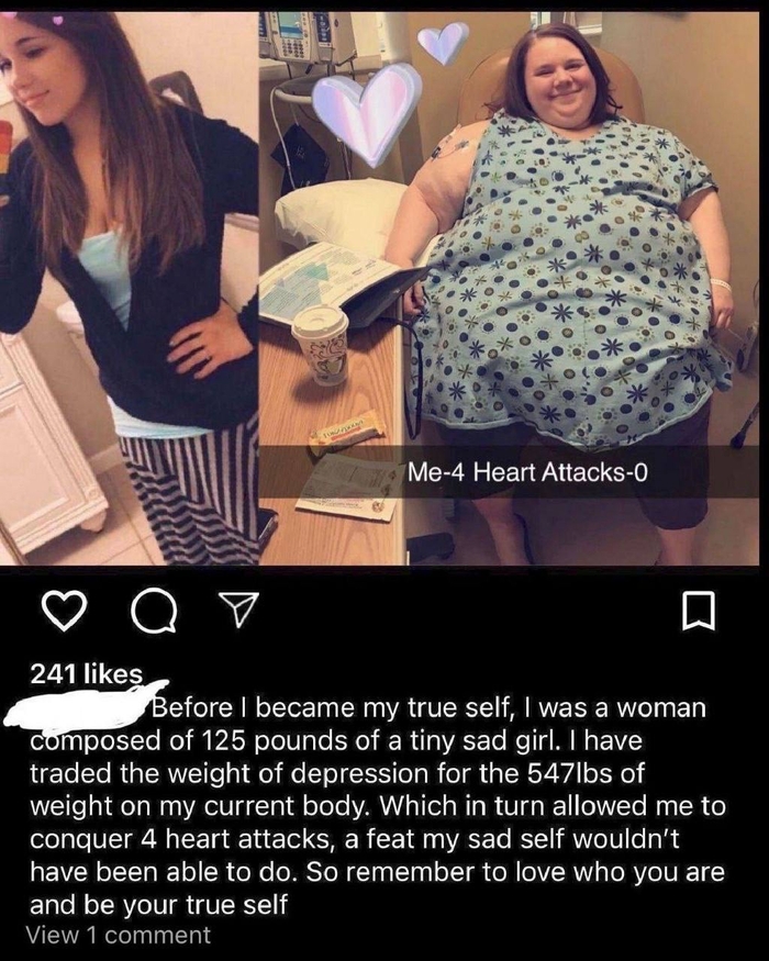 «До того как я обрела истинную себя, во мне было 56 кг депрессии и грусти. Я разменяла это на 248 кг текущего веса. Это позволило мне успешно пережить 4 сердечных приступа, на что прежняя я была бы просто не способна. Так что любите себя такими, какие вы есть на самом деле. Будьте собой».
