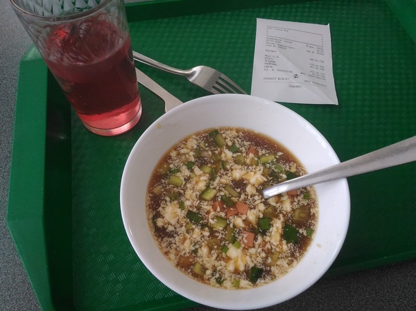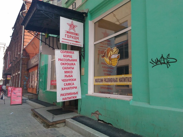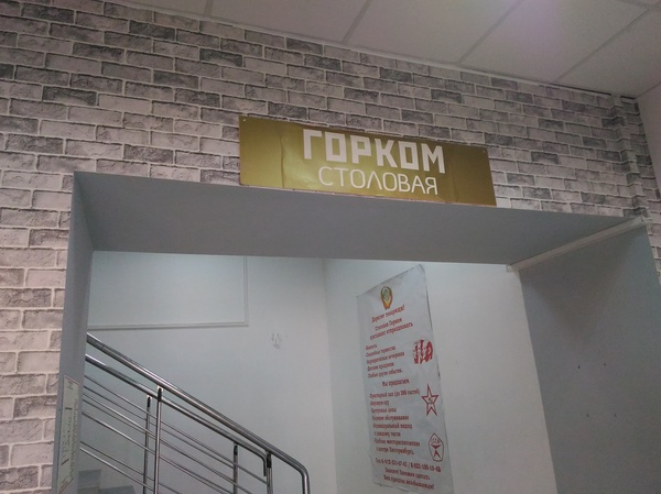 Идете на второй этаж, и кроме Горкома, никуда не попадете. Я поела недорого, 60 с чем-то рублей. Взяла окрошку и морс со льдом. Лед стоит после кассы - бесплатно. На фотке лед уже почти не видно, поздно решила показать) Окрошка у них только с квасом.