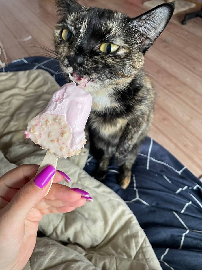 Видит в миске вкусный корм.
