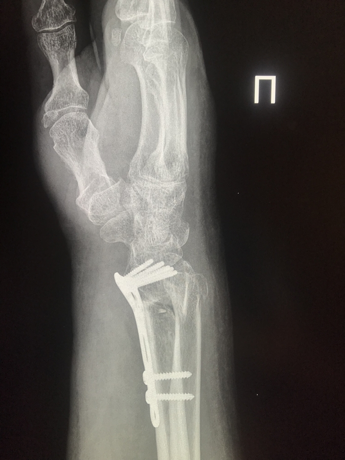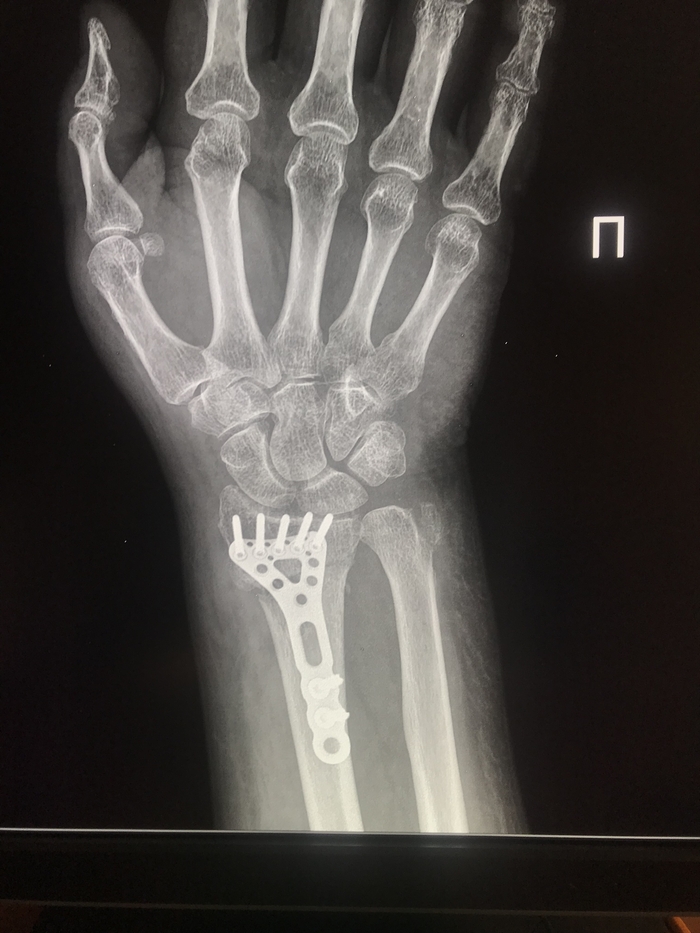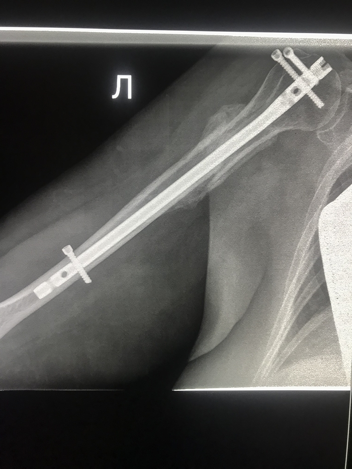 Пластина и штифты на плечевой кости. Перелом произошёл после падения с электросамоката. Восстановление долгое.