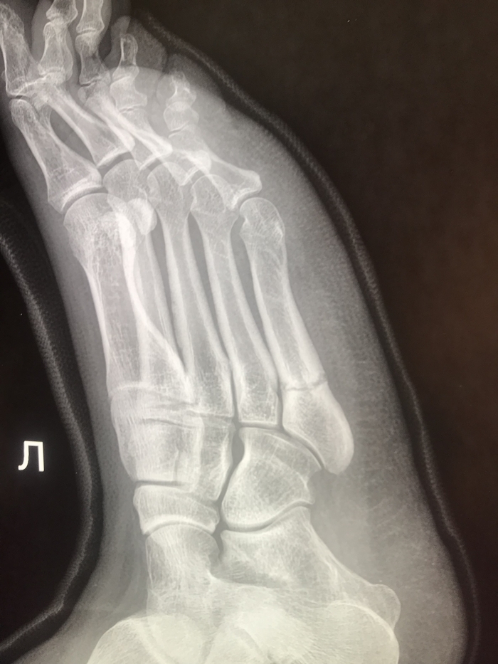 А вот так выглядит перелом пятой плюсневой кости. Пациентка уже с гипсом, сказала что упала с велосипеда.