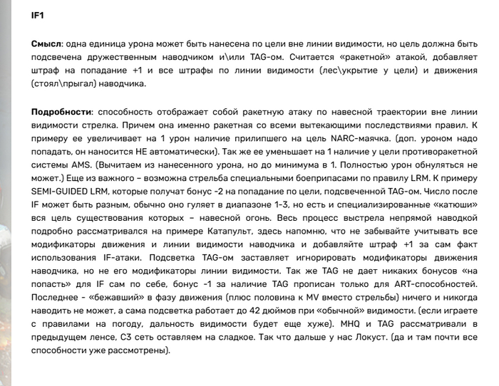 Так же мною были замечены значительные, на мой взгляд, ограничения для способностей и спецбоеприпасов. Да, ты можешь заменять обычные атаки атаками способностью (кроме IF#, поскольку это - альтернативная атака) вплоть до их полного урона. На примере Катапульты с уроном 3/2/2 со способностью LRM 1/2/2. На ближней дистанции можно изменить 1 урон на LRM. А на средней и дальней можно заменить оба урона на LRM и применить спецбоеприпасы. НО! Ты никак не можешь увеличить количество выстрелов, ни способностью мехвоина, ни чем то ещё. Вроде бы, правила адекватные, но что то меня напрягает и я не скажу.
