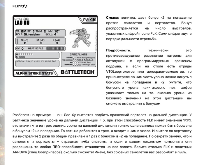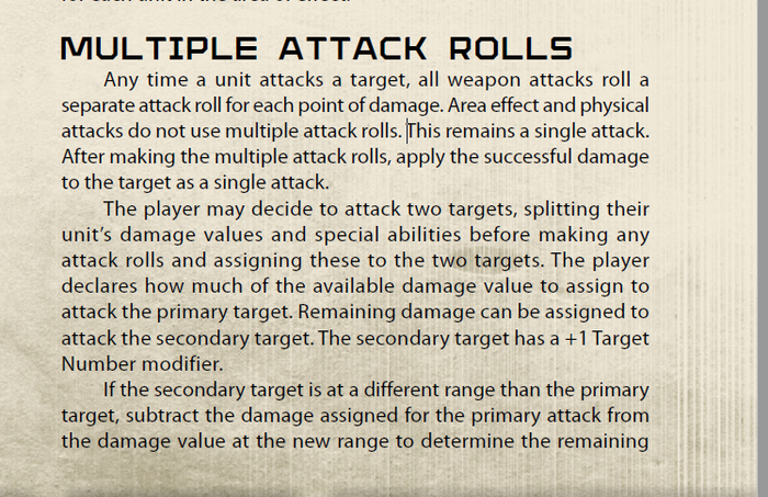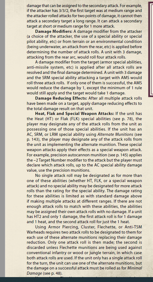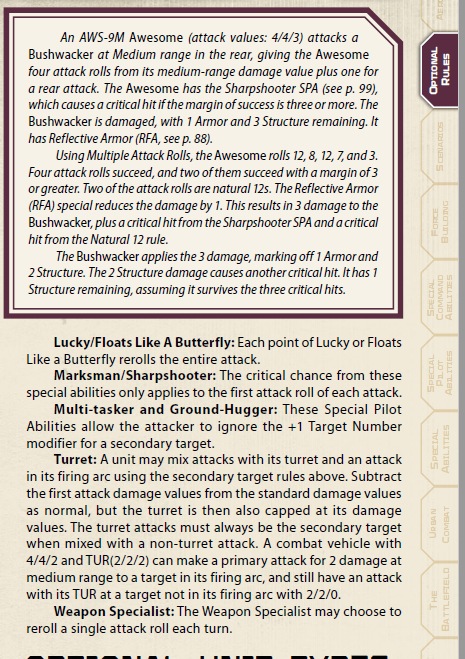 Как видно, правило очень длинное и объёмное, но основной смысл: на каждую 1 урона должно производить по броску атаки, можно производить атаки по другим целям". А потом начинаются дополнения и условия. В первую очередь понравившееся лично мне условие, что все попадания по этому правила объединяются в один стак, после чего и наносится урон. Это такая защита от абуза системы критов, где два урона по внутренней конструкции от одного меха будет наносить не 1 крит, как обычно, а 2 крита за каждую успешную атаку по этим правилу.