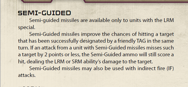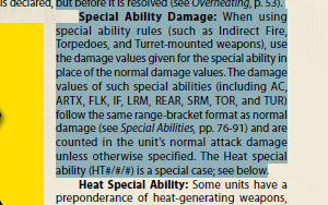 AC/LRM/SRM (или по русски АП/РБД/РМД - автопушка/ракеты большой дальности/ракеты малой дальности): В отличие от старых правил, где эти способности были альтернативной атакой, заменяющей основную, в новых правилах теперь являются частью атаки, а в описание самой способности указано только возможность использовать спецбоеприпасы: