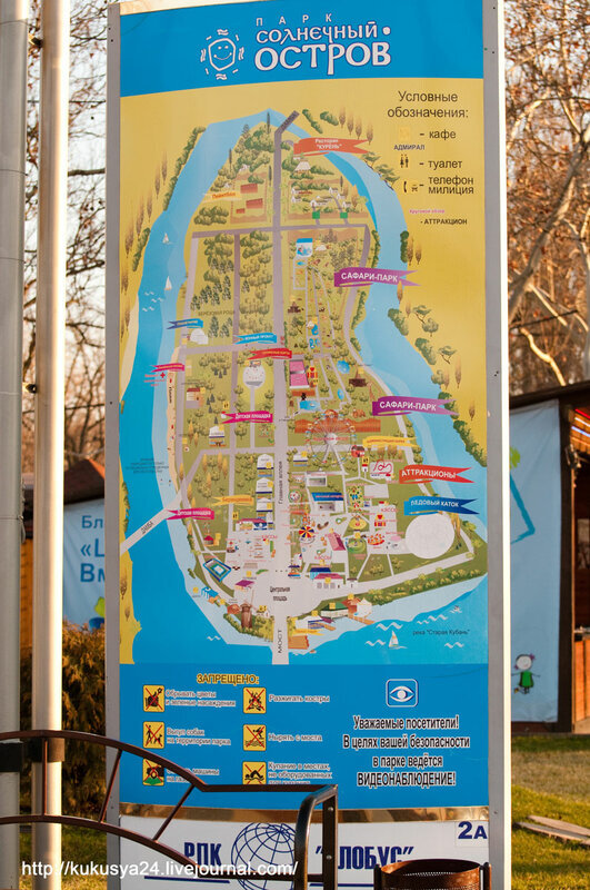 Именно таким парком и является "Солнечный остров". Уже на входе ты видишь и тень деревьев, и солнечные места, и места, где можно посидеть, и даже, о ужас, карту парка, помогающую в ориентации по парку.