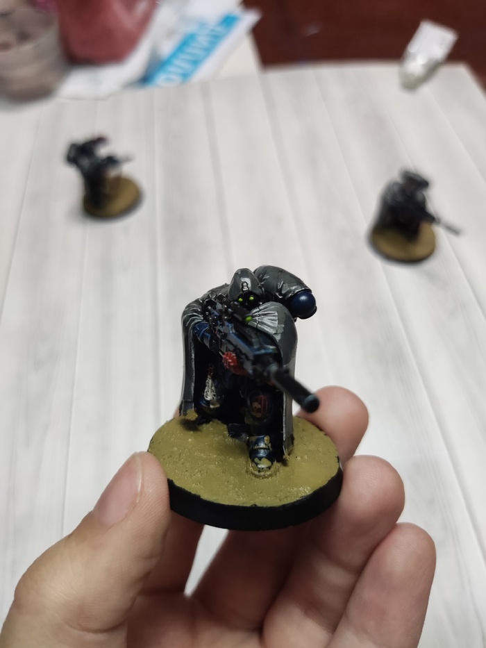 Осталось совсем немного - покрыть светящиеся элементы краской Citadel Tesseract Glow, оформить стекло краской Vallejo Light Sea Blue (и кто сказал, что краски серии Air нельзя наносить кистью? Ах да, я) и оформить базу краской (краской ли?) Armageddon Dust, ну и залакировать всё. В итоге получились вот такие милые Уничтожители ордена Багровых Кулаков: