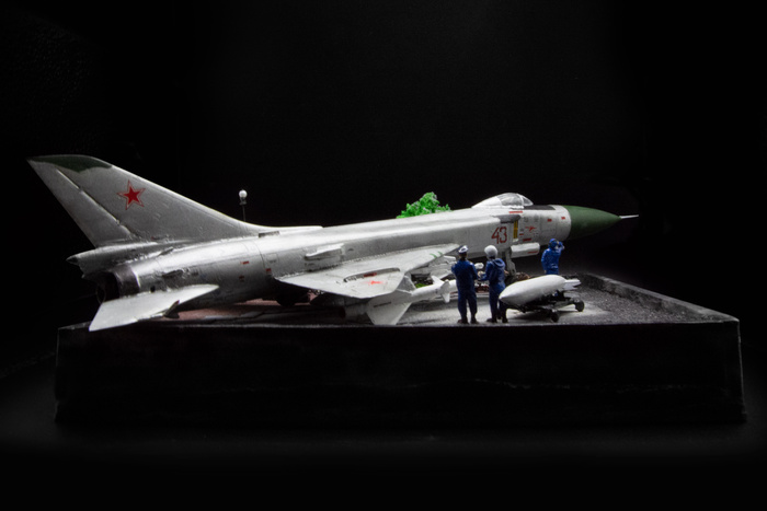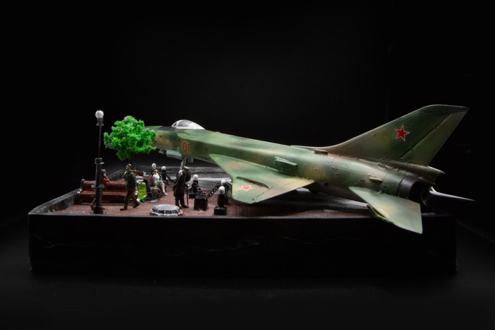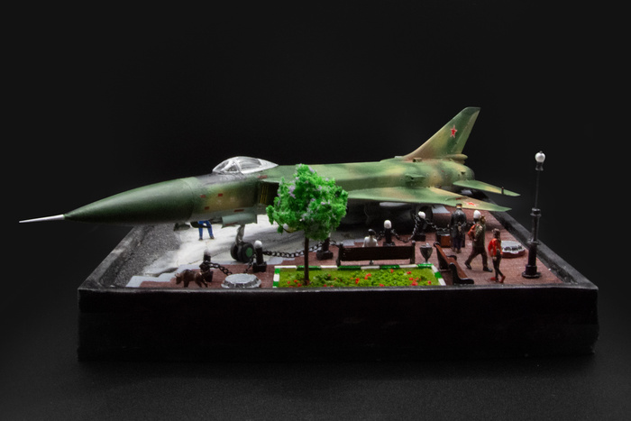 Когда-то Су-15 был самым массовым истребителем-перехватчиков в Советском Союзе, но по договору СНВ-2 большая часть машин была списана и распилена на металлолом. Немногочисленные оставшиеся экземпляры сейчас находятся в авиа-музеях или стоят в парках в качестве памятников. История самолет определила концепцию для подставки - хотел показать одновременно и прошлое, и настоящее время, но без излишней депрессии и упадничества.