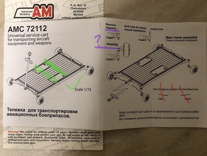 Аэродромная тележка – AMC, модель неплохая, но смутила необходимость клеить очень-очень мелкие детали цианакрилатом и ужасная инструкция. И если первое я еще могу понять, а кому-то это даже понравится, то инструкции нет оправдания: указаны детали, которых нет в комплекте и не описана сборка части деталей, которые есть. + язык «прыгает» с английского на русский.