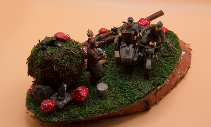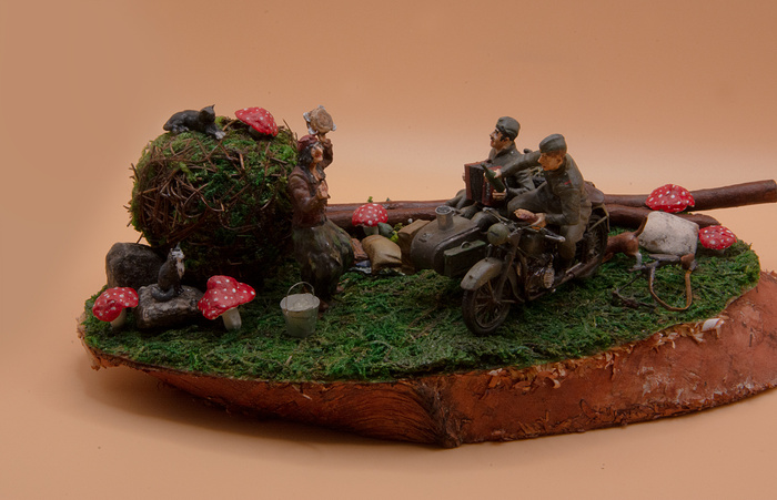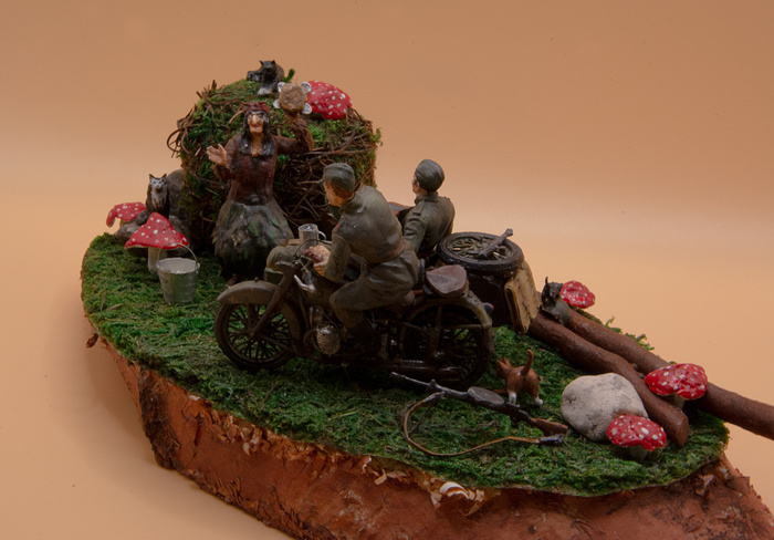 Модель мотоцикла М-72 от Звезды, масштаб 1:35. Баба Яга и Коты - от СВ Модель (разные наборы). Из полностью самодельного - только мелочевка: грибы, ремень для пулемета, яблоко, стакан, хлеб в руке солдата и бубен. Красил красками от Тамии и Звезды, дерево покрыл морилкой.
