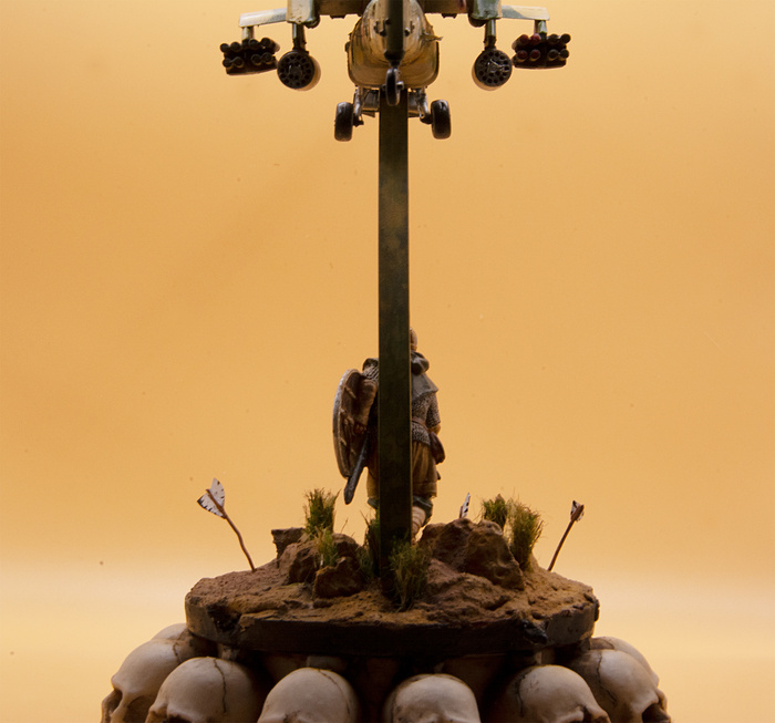 В качестве подставки я использовал старую пепельницу, которую покупал для бывшей жены лет 10 назад - она курила и я хотел, чтобы в процессе она не забывала, что это все таки вредно (такой себе ретро-аналог страшных картинок на пачках сигарет). Бывшей пепельница - внезапно - не понравилась и долге годы она стояла без дела, пока я не увлекся моделизмом и не решил ее использовать в какой-нибудь композиции. Все содержимое подставки - грунт, трава и стрелы - самодельное.