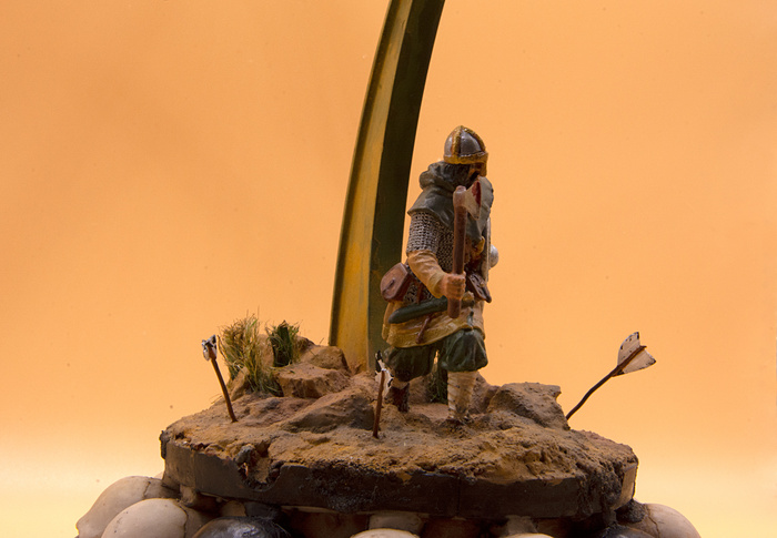 Для дружинника использовал оловянную модель от Ekastings, 35 масштаб. Это был мой первый опыт покраски металлических фигур и в целом работа с металлом понравилась мне гораздо больше, чем с пластиковыми или тем более смоляными человечками - детализация выше, краска ложится лучше, не нужно руки приклеивать и форма не плавится от клея или грунта. Буду брать еще, жаль только, что у них ничего нет в 72 масштабе, 35 я все таки меньше люблю.