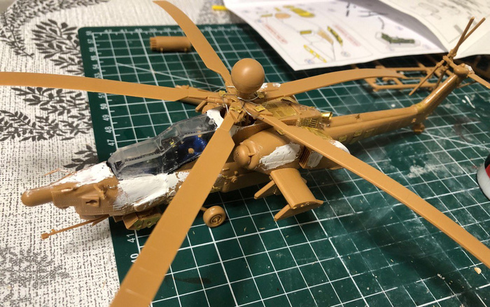Главная трудность, возникшая при сборке - необходимо было отрезать переднюю часть кабины, доставшуюся модели по наследству от Ми-28 А и приклеить новый "носик" от модификации НЭ. И естественно, нос добровольно приклеиваться категорически не хотел, пришлось использовать шпаклевку. Шпаклевкой я заляпал стекла кабины и так и не смог вывести ее до конца, пришлось тонировать черной краской, что вдвойне было обидно, т.к. я разорился на 3д интерьер от того же микро-дизайна. Чтобы черные стекла смотрелись органично, все остальные детали тоже припылил.