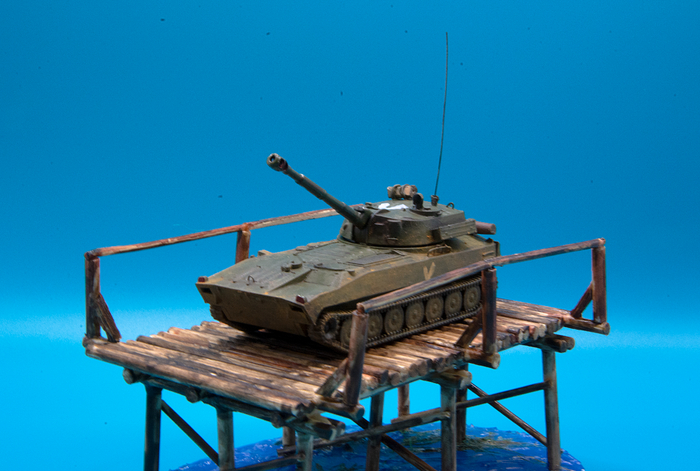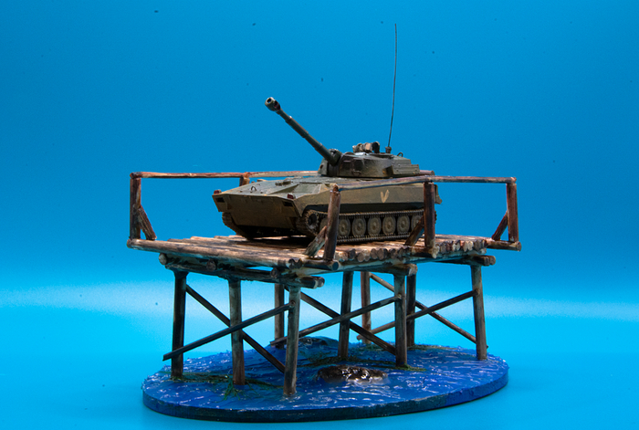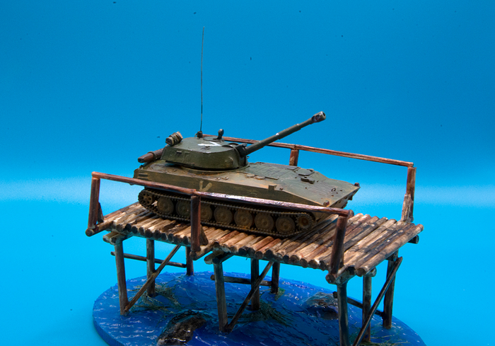 Крошечная модель от "Звезды", немного дополнил ее самодельными поручнями, антенной, бревном и скаткой. Мост сделал из спичек и зубочисток и состарил морилкой, вода - акриловая краска + гель, к эпоксидке душа не лежала (делаю параллельно другую сложную композицию с ней и уже морально устал от этого материала)