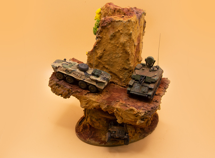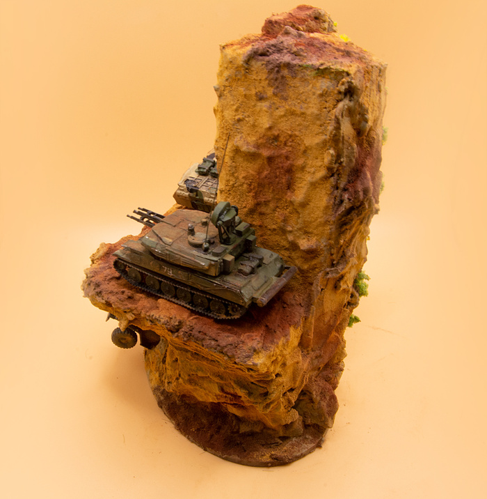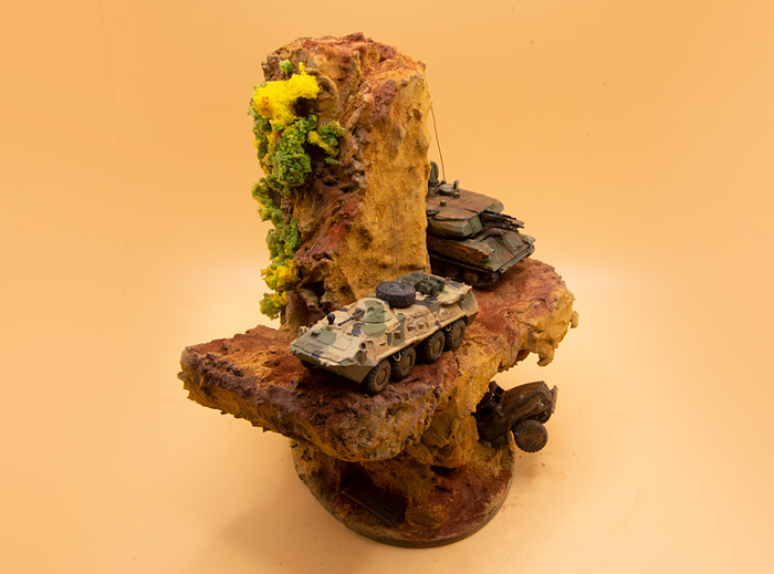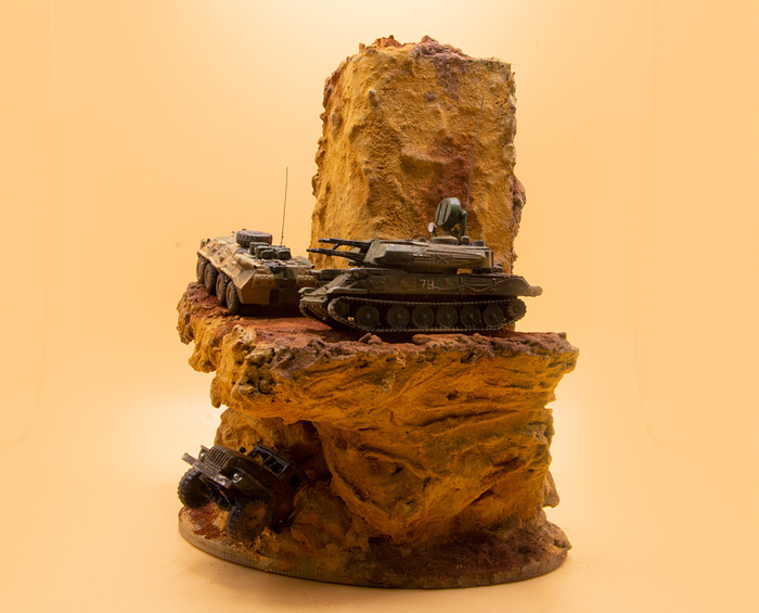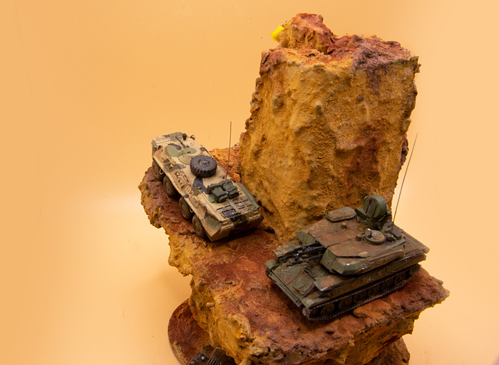 Пара крошечных моделей от "Звезды" - БТР 80 и Шилка в масштабе 1:100. Для БТР'а также самостоятельно изготовил из проволоки все поручни (на моделях такого масштаба у "Звезды" они обычно полностью отсутствуют), антенну и пару снарядных ящиков из спичек, а сверху положил колесо от Урала того же производителя. Для Шилки сделал только ящик и антенну. Красил акрилом от Тамии + пигменты Zip maket.