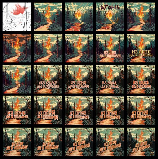 Пока мы занимались геймплеем, художница прорабатывала варианты обложки. Варианты на скриншоте - это даже не десятая часть промежуточных этапов создания обложки. Тем не менее, обложку все же удалось изобразить в нужном стиле, итоговый вариант был утвержден.
