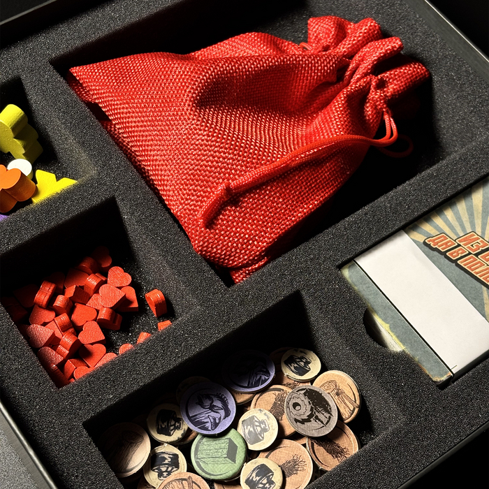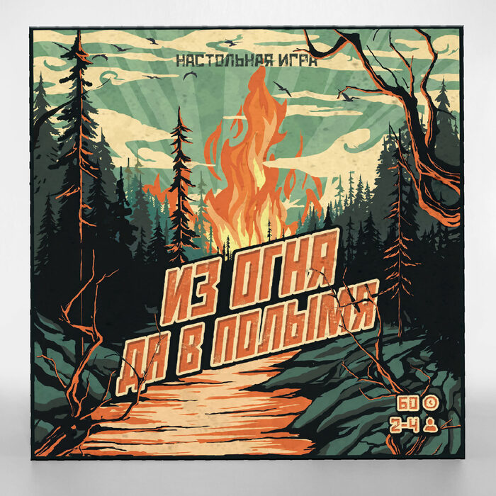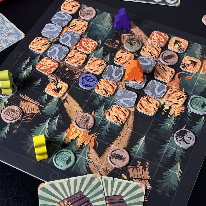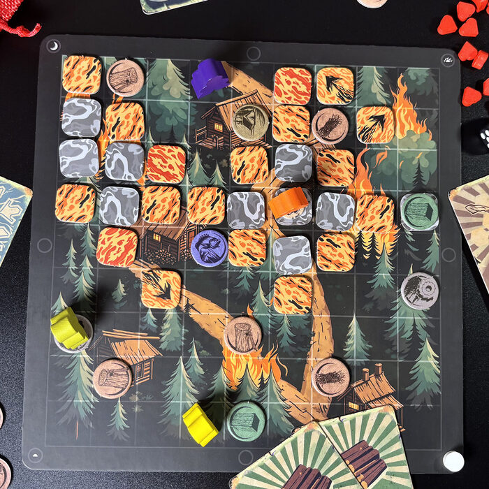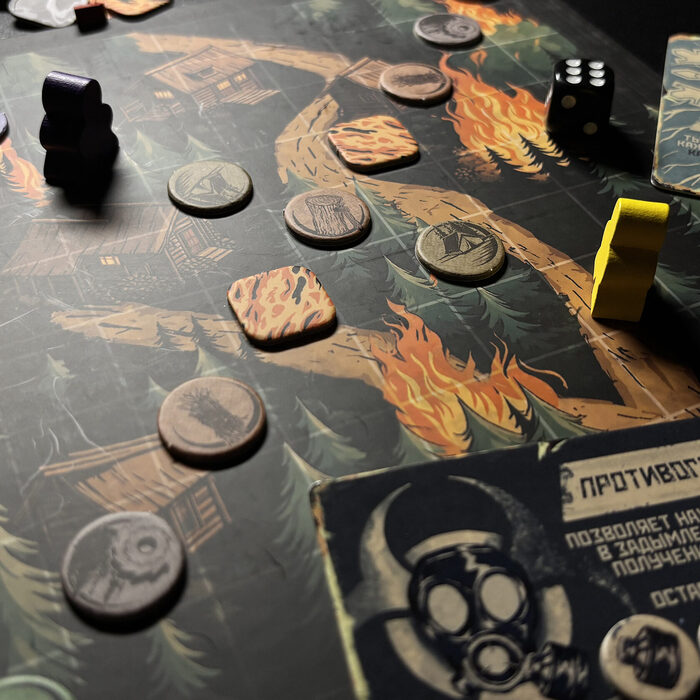 Игра наконец-то стала интересной. Мы могли играть по нескольку длинных партий подряд, меняли количество игроков, а когда баланс приблизился к идеалу, мы перешли к доработке дизайна. Тайлы пожара получили яркие арты и удобную форму, деревянные фигурки были окрашены в цвета, сочетающиеся с общей палитрой игры, коробка и поле были, наконец, готовы, мы также нашли подходящие по цвету и стилю мешочки для хранения тайлов, проработали ложемент для удобного хранения компонентов, ну и, конечно, же, сверстали подробные правила игры.