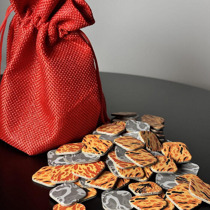 81 тайл огня в мешочке: здесь для нас также не было ничего нового. С тайлами мы уже работали, как с пластиковыми в игре "Моя хата с краю", так и с картонными в "Раст на раст не приходится". Ну и мешочки в наших играх тоже уже встречались.