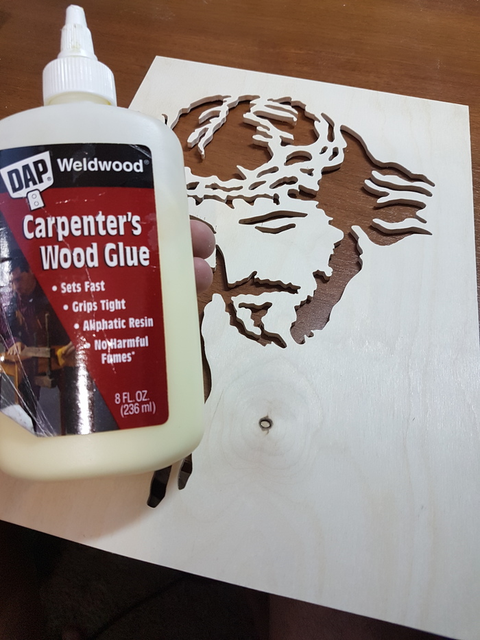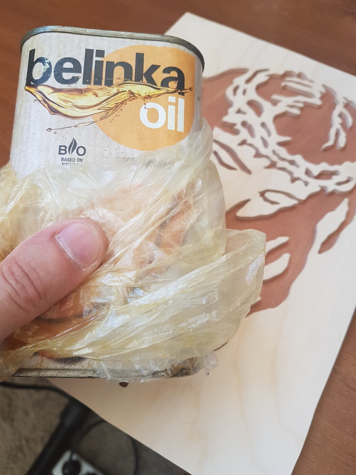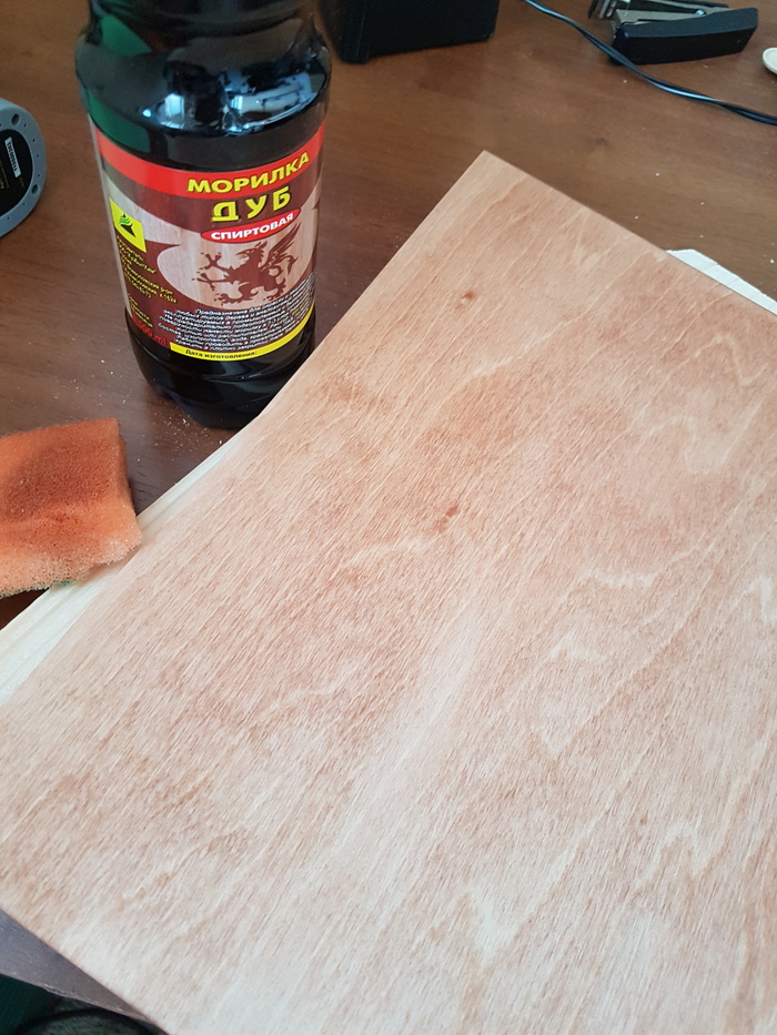 Торопиться было некуда, поэтому детали клеились сутки. Зажимал к столу через лист лдсп струбцинами что бы в момент склейки фанеру не начало выгибать. Увы, фото нет. Но есть фото бутылочки масла которым я покрывал панно.