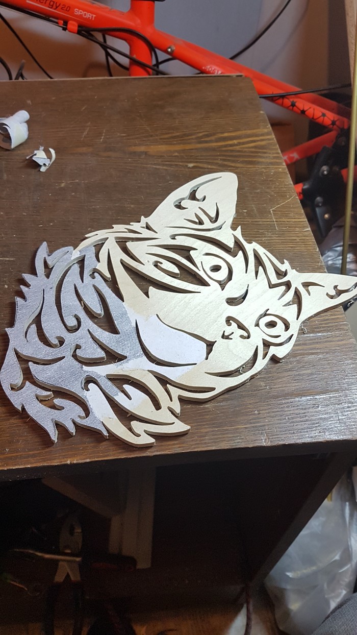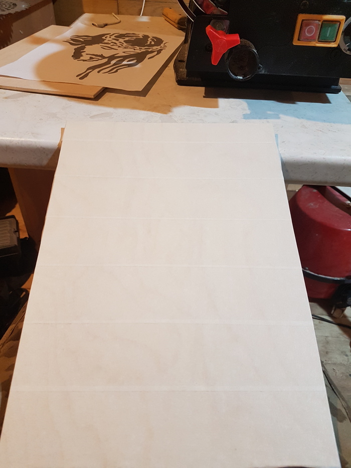Лист 4мм фанеры обклеил малярным скотчем, потом уже поверх скотча на клей карандаш приклеил шаблон для выпиливания.