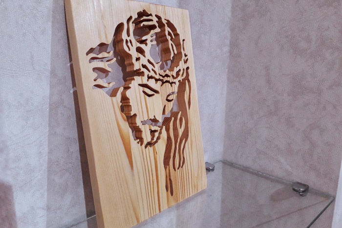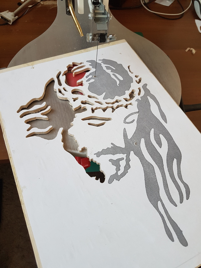 Наткнулся на Pinterest'e на эскиз Иисуса Христа. И чет мне так захотелось такое выпилить, кто бы знал. Прогнал сохрененную фотку через фотошоп, отсек все лишнее, выровнял размер и пустил на печать.