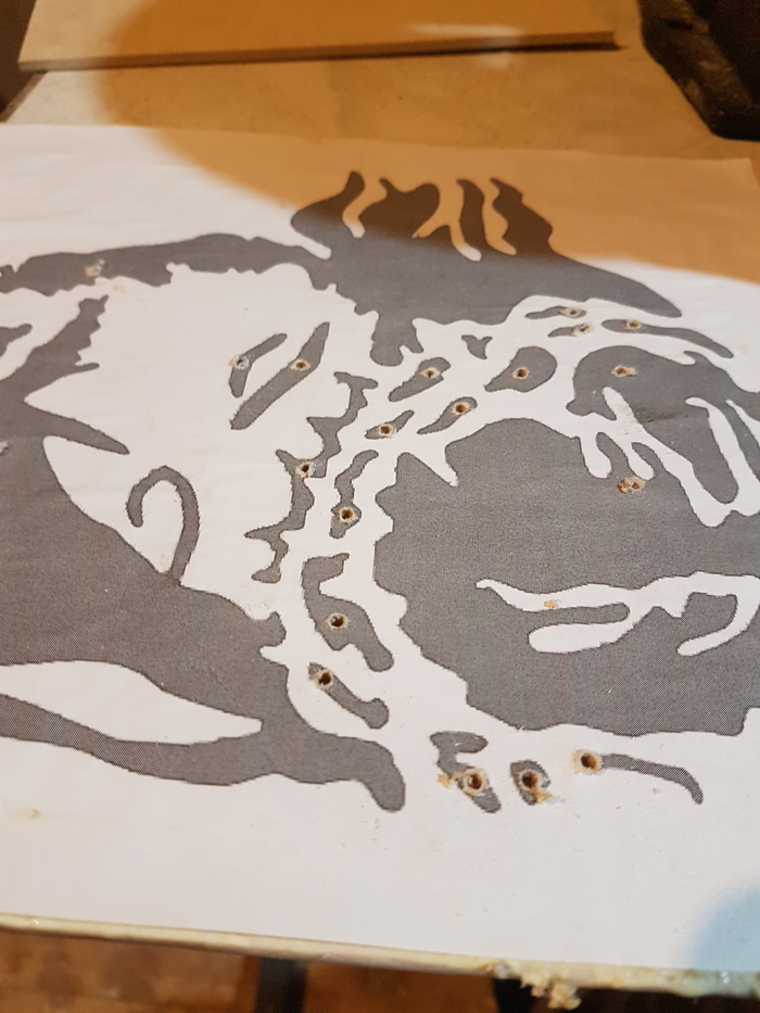 Клей высох, шаблон приклеен, пора взять дрель и сверло 2-2.5 мм и засверлиться в заготовку. Так как вырезать буду только внутри заготовки, стараюсь не пропускать серые области. Но как потом оказалось, все равно пропустил.
