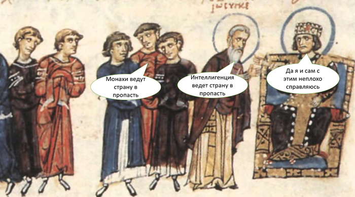 "Ватники" в Византии были "монашеской партией" - это были христианские традиционалисты из монахов и им сочувствующих. Они топили за то, что надо жить по догматам истинной веры, а вера латинян суть ересь и подрывает скрепы. При этом, что вообще смешно, монахи то топили за универсалистскую империю по заветам предков, а латинофороны - за эллинский национализм. Обе фракции друг друга так не любили, что пытались постоянно выдавить друг дружку, для чего не чурались доносов и прочих гадостей.
