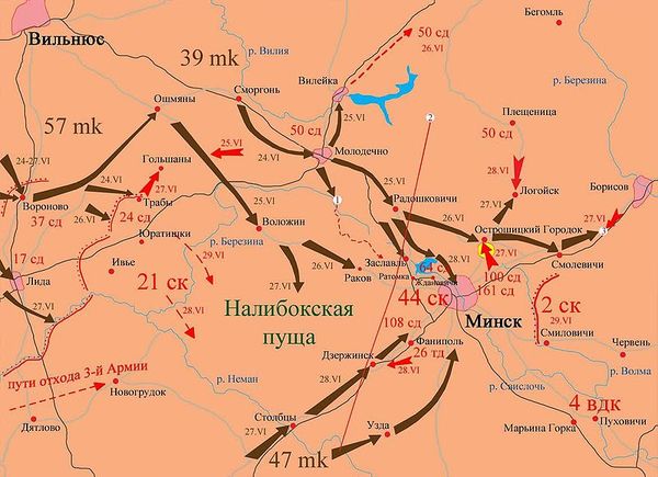 Перед войной основная часть войск округа располагалась в глубине, непосредственно на границе располагались армии прикрытия, немногочисленные и неспособные выдержать удар основными силами врага. Еще в середине июня к границе начали подтягивать войска 2-го и 3-го эшелона, но на это нужно было 2-3 недели, а их уже не было. Когда подразделения из тыла округа только садились в эшелоны, вермахт уже перешел границу. Итогом этого стал срыв планов развертывания, войска сразу по прибытии, без подготовки и сосредоточения бросали в бой – затыкать места прорыва. Это было единственно возможным в тот момент решением, но оно могло лишь оттянуть момент, когда враг снова прорвет фронт.